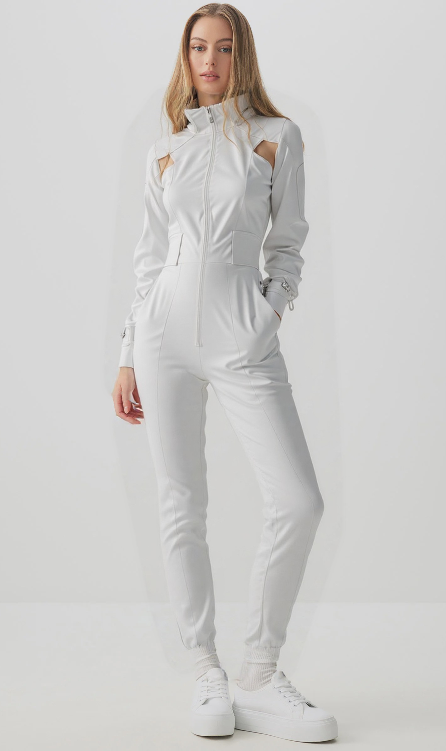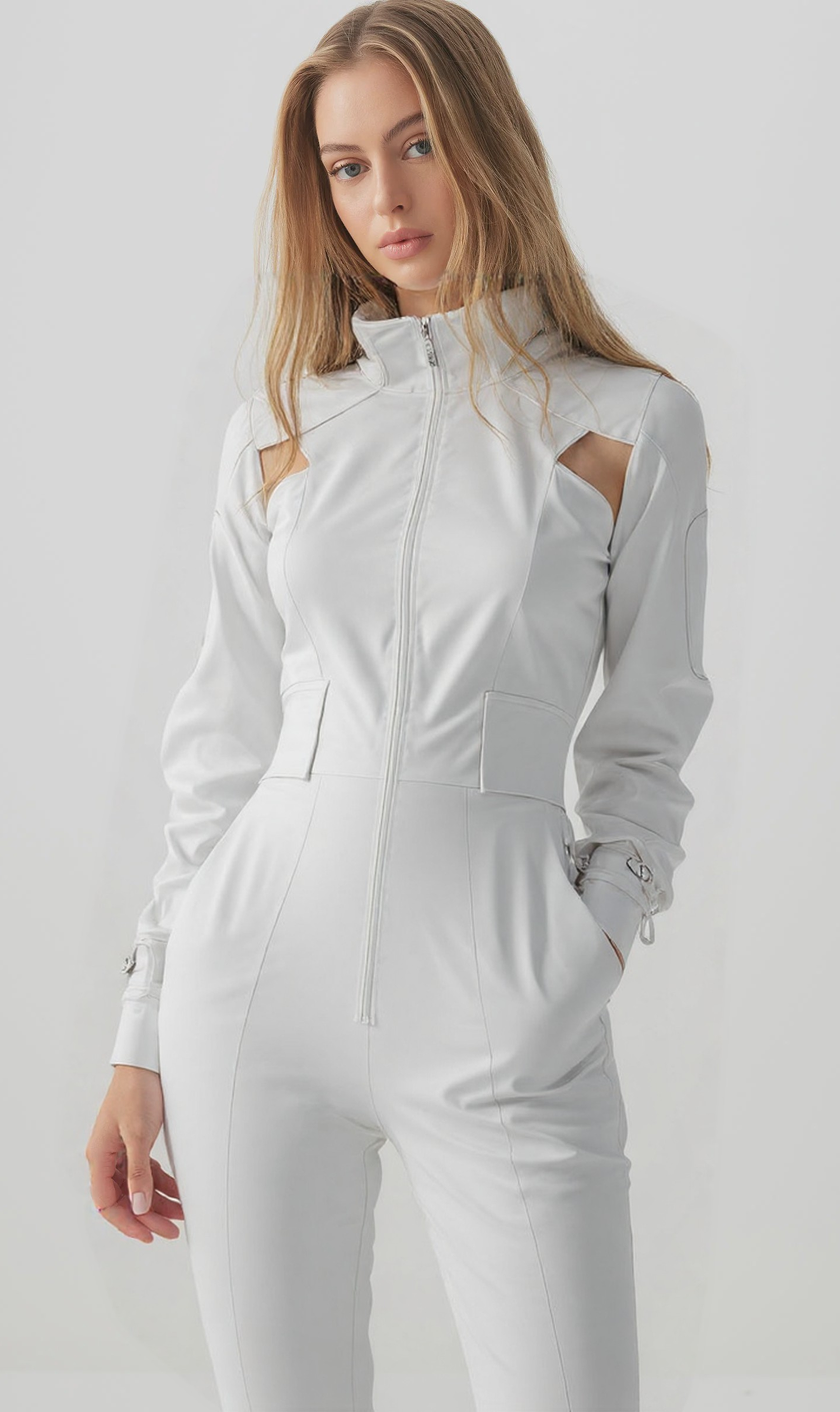 Take flight in the NeoFlight Suit — a high-performance one-piece designed with bold cut-outs and sculptural seams. The sleek silhouette features a high collar, zip-front closure, and tailored fit that flexes with you. Engineered to command attention, it’s part utility, part uniform, and fully elevated.