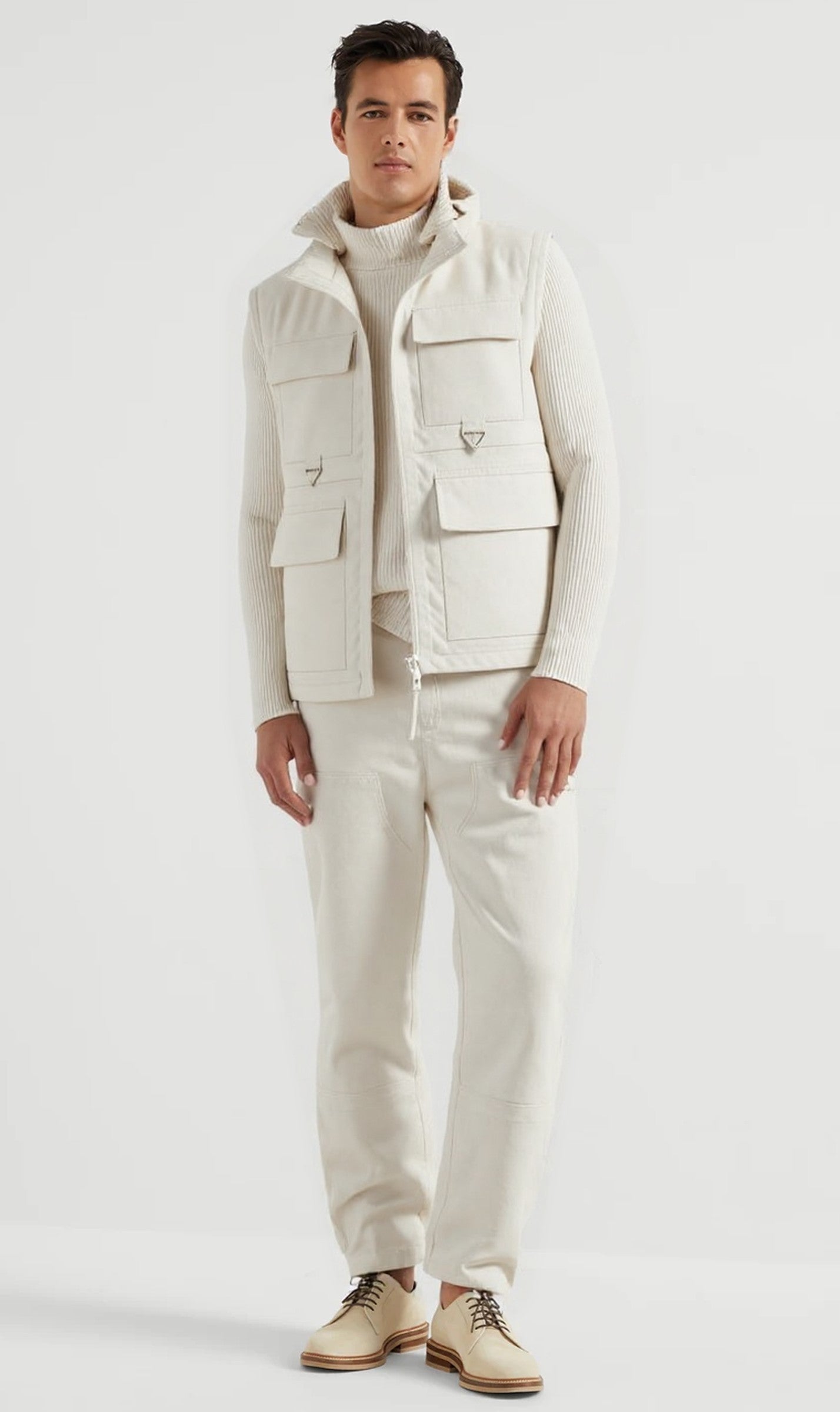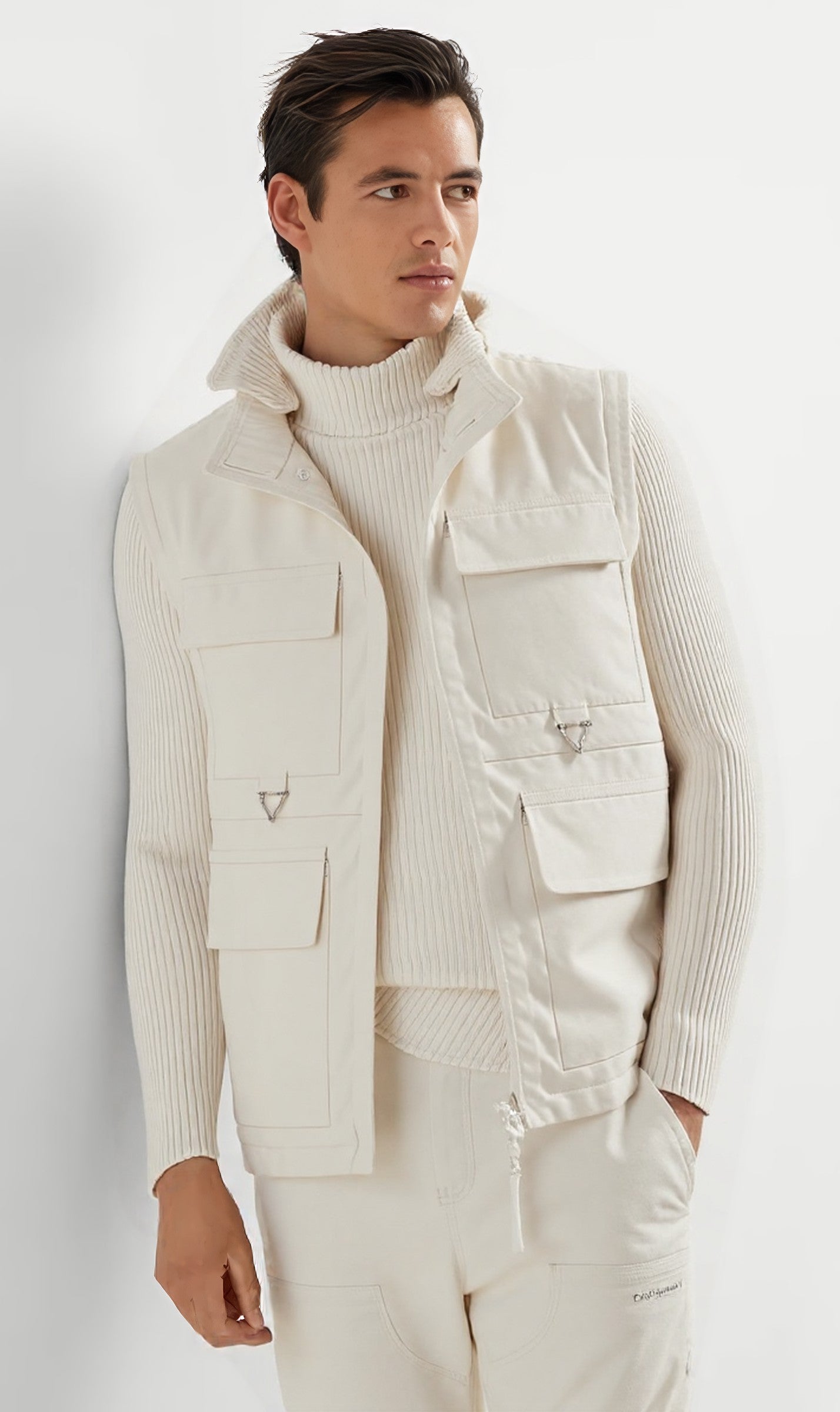 Command cold-weather style with the Polar Authority Set — a utility-inspired ensemble crafted for both form and function. The structured canvas vest adds sharp definition and practical flair with oversized pockets, while the ribbed turtleneck and relaxed trousers balance texture and ease. A sophisticated blend of rugged charm and minimalist layering.