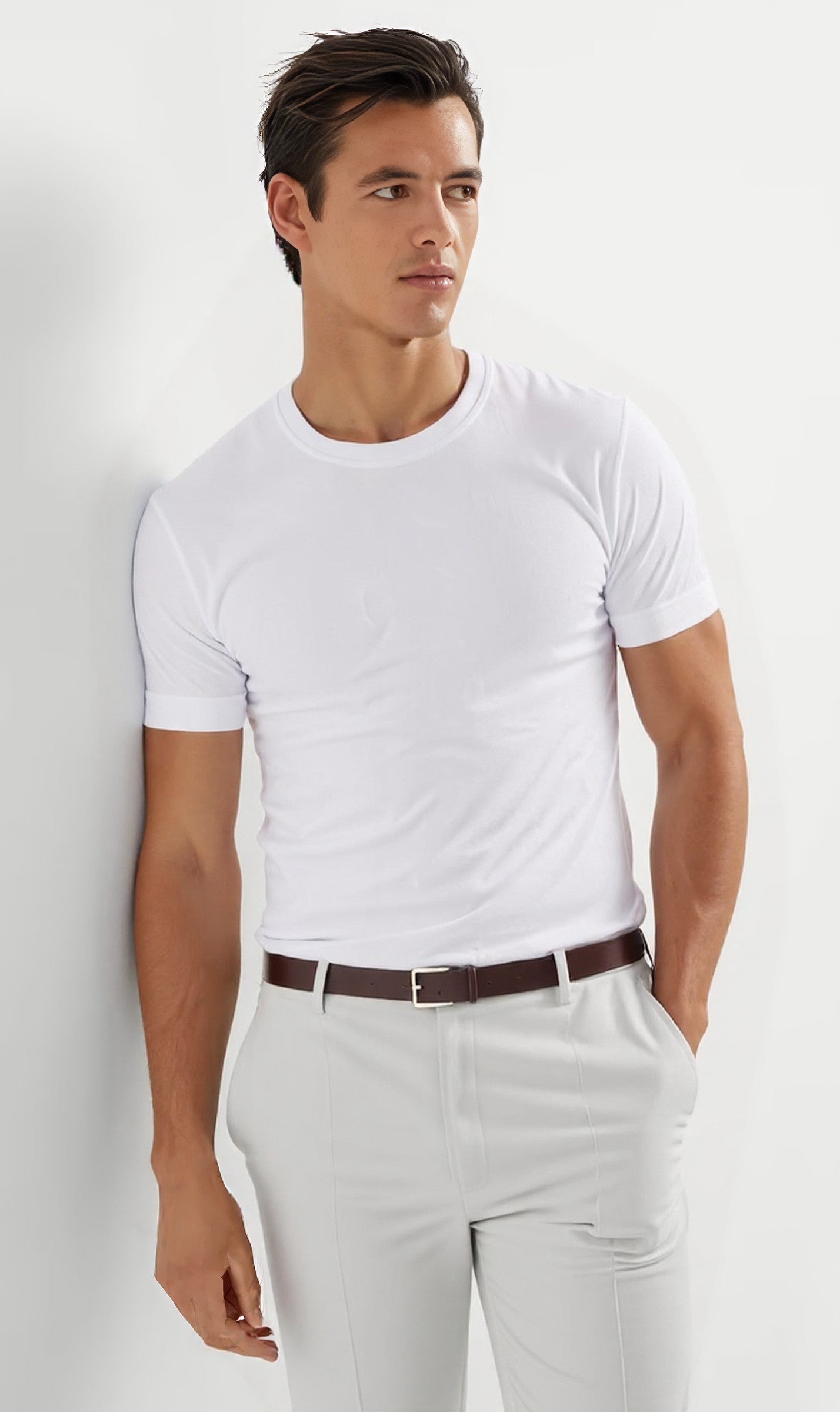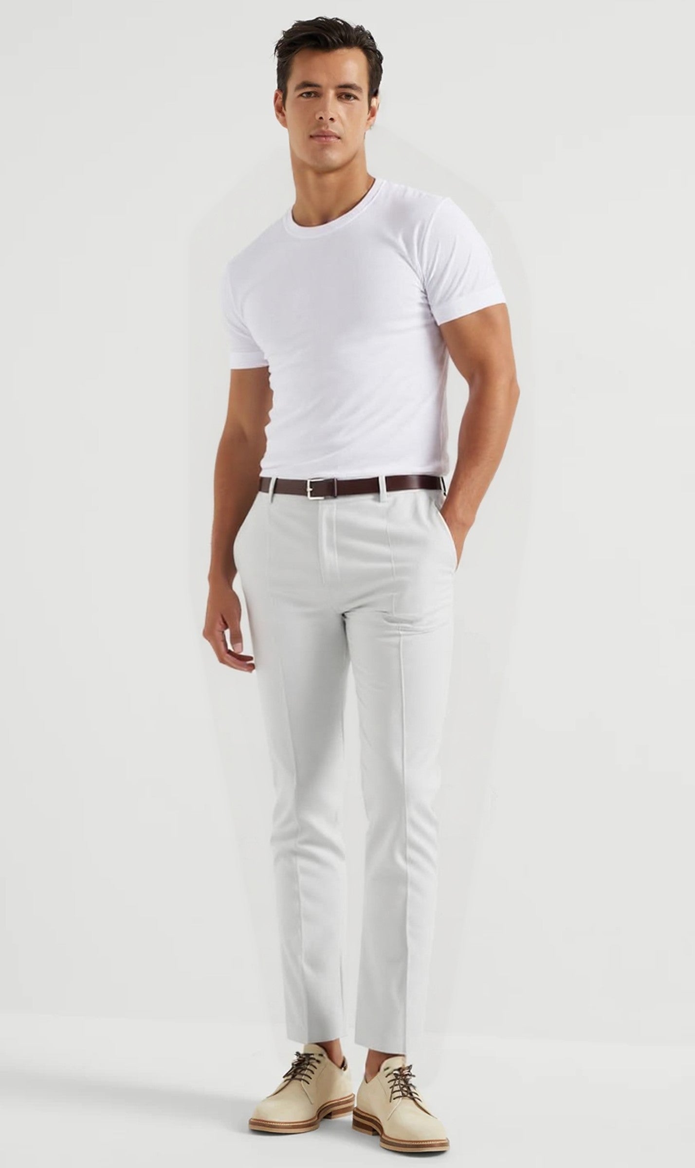 Simplicity meets precision in the Studio Core Set — a crisp and versatile pairing designed for everyday polish. The fitted crew-neck tee brings breathable ease, while the tailored white trousers elevate the silhouette with sharp pleats and a streamlined fit. Finished with a dark leather belt for contrast, it’s a go-to look for smart minimalism.